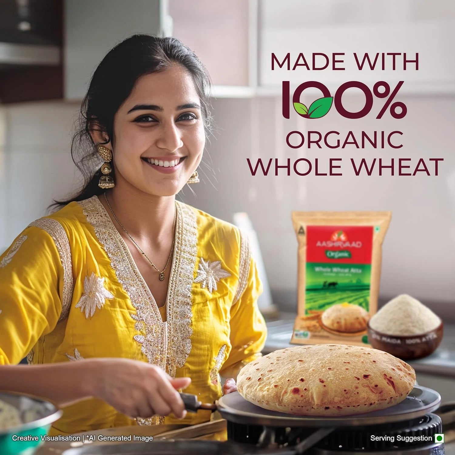 Aashirvaad Organic Whole Wheat Atta is made from 100% organically grown wheat, free from chemicals and pesticides. It offers natural nutrition, rich fiber, and a wholesome taste for a healthier, balanced lifestyle.